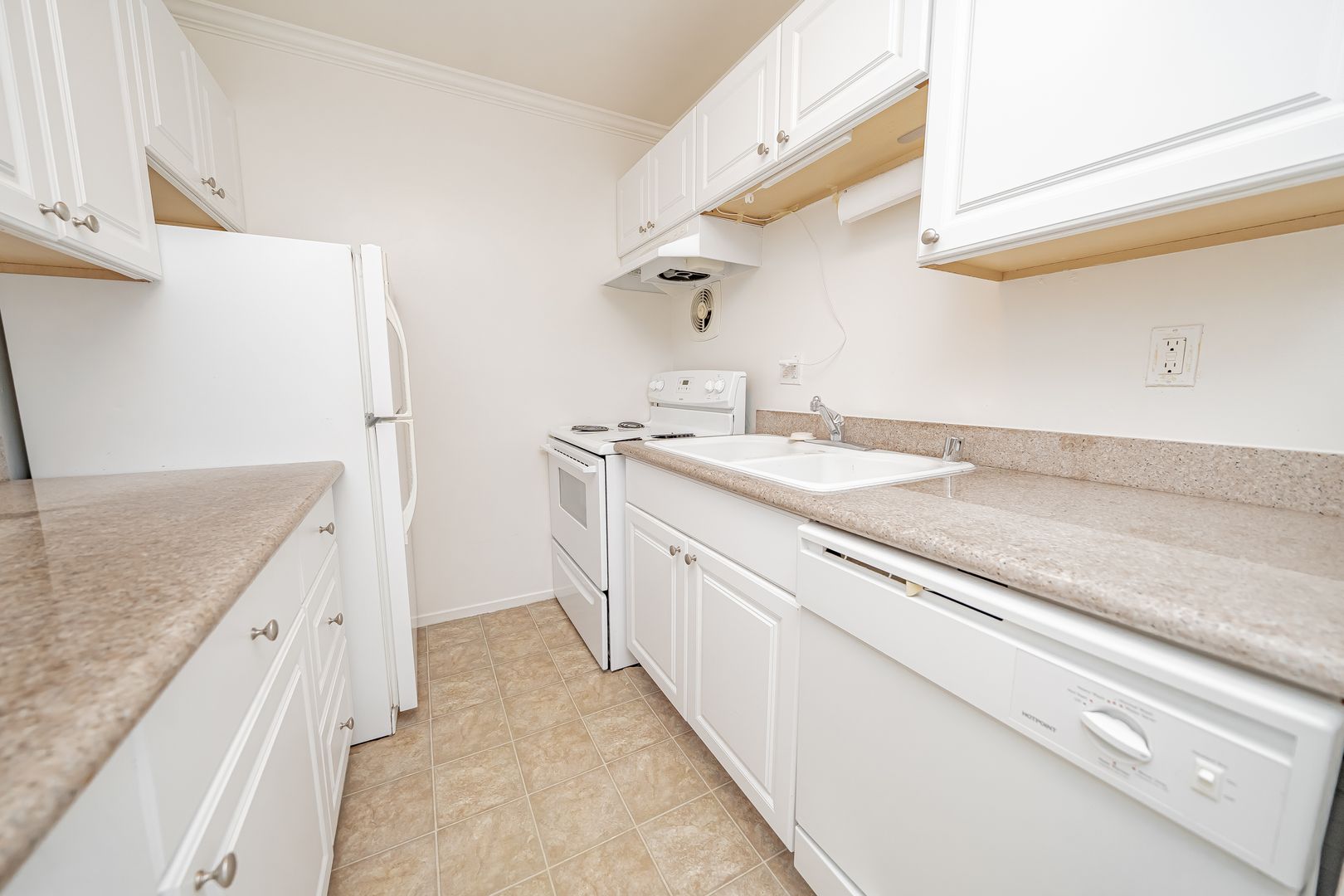 • Modern kitchen with granite countertops, dishwasher, refrigerator, and disposal