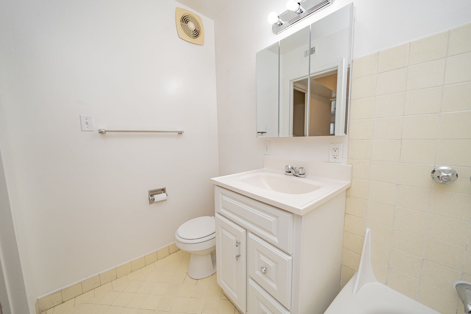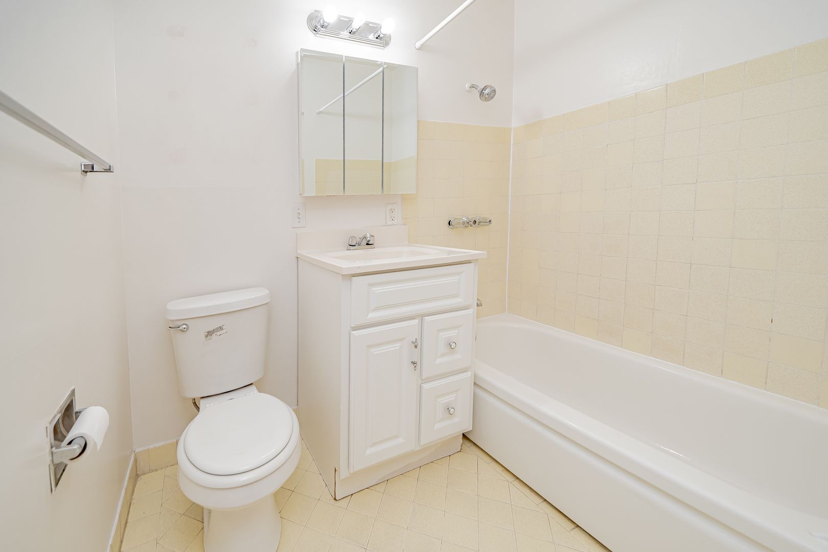 • Tiled bathroom with shower and bathtub combo